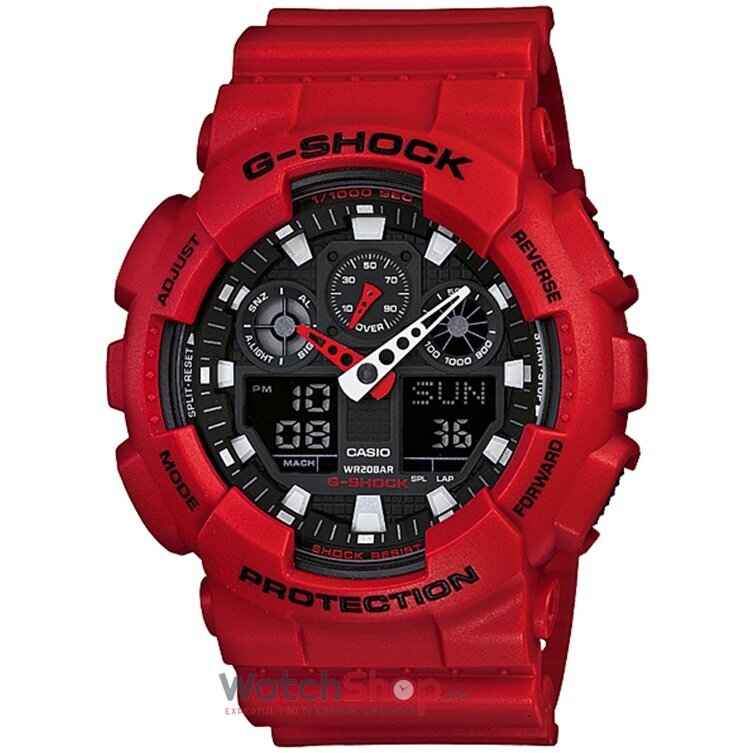 Ceasul original barbatesc Casio GA-100B-4AER, din colectia G-Shock, face parte din categoria ceasurilor Casual. Mecanismul ceasului este unul quartz, adapostit de o carcasa de forma rotunda, cu capac opac. Carcasa ceasului este din plastic și are culoarea . Diametrul carcasei este de 51 mm, iar grosimea de 17 mm. Ceasul Casio GA-100B-4AER are curea de silicon de culoare roșu si cadranul analog-digital de culoare negru, acoperit de un geam din cristal mineral. Rezistent la apa pana la o adancime de 200 m (20 atm), ceasul dispune de urmatoarele functii: data, luna, zi, ora, minut, secunda.