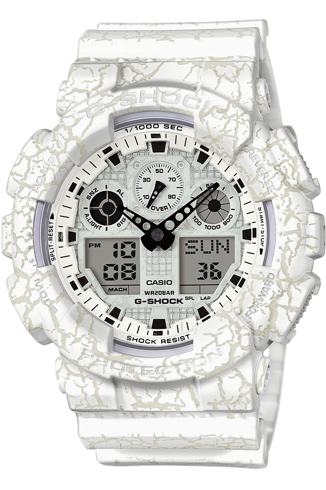 Ceasul original barbatesc Casio GA-100CG-7AER, din colectia G-Shock, face parte din categoria ceasurilor Casual. Mecanismul ceasului este unul quartz, adapostit de o carcasa de forma rotunda, cu capac opac. Carcasa ceasului este din plastic și are culoarea . Diametrul carcasei este de 51 mm, iar grosimea de 17 mm. Ceasul Casio GA-100CG-7AER are curea de silicon de culoare crem si cadranul analog-digital de culoare crem, acoperit de un geam din cristal mineral. Rezistent la apa pana la o adancime de 200 m (20 atm), ceasul dispune de urmatoarele functii: data, luna, zi, ora, minut, secunda.