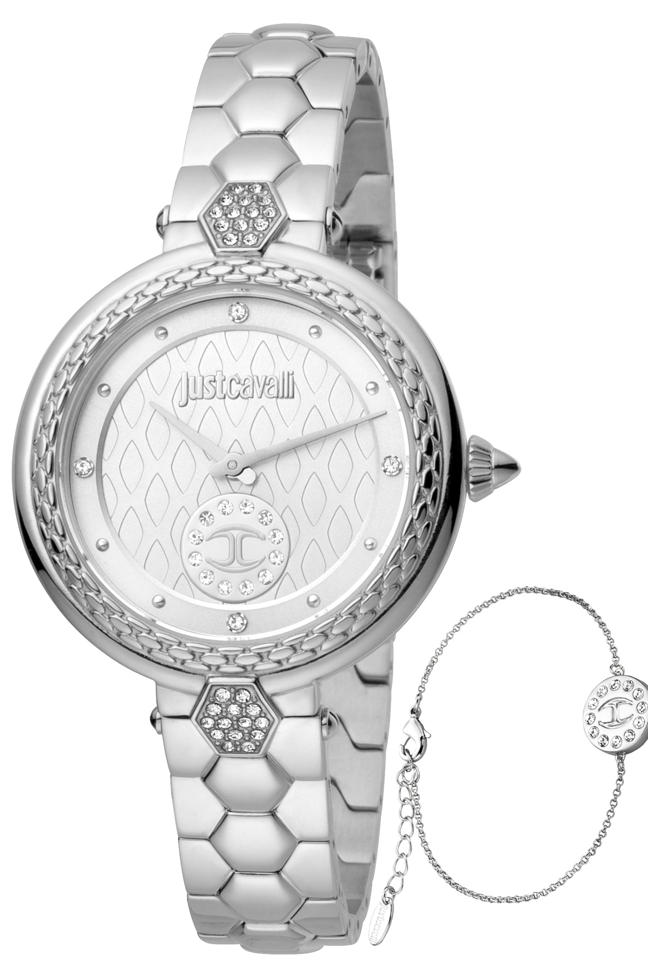 Ceasul original de dama Just Cavalli JC1L128M0055, din colectia SETS, face parte din categoria ceasurilor Casual. Mecanismul ceasului este unul quartz, adapostit de o carcasa de forma rotunda, cu capac opac. Carcasa ceasului este din otel inoxidabil și are culoarea . Diametrul carcasei este de 34 mm, iar grosimea de 7 mm. Ceasul Just Cavalli JC1L128M0055 are bratara de otel inoxidabil de culoare argintiu si cadranul analog de culoare argintiu, acoperit de un geam din cristal mineral. Rezistent la apa pana la o adancime de 30 m (3 atm), ceasul dispune de urmatoarele functii: ora, minut, secunda.