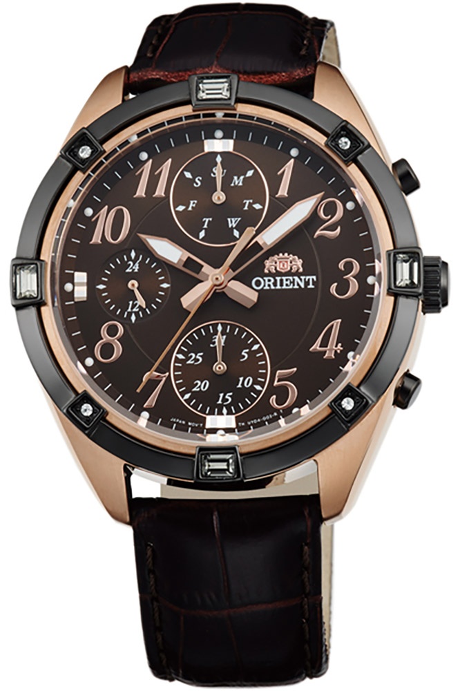 Ceasul original de dama Orient FUY04004T0, din colectia Classic, face parte din categoria ceasurilor Elegant. Mecanismul ceasului este unul quartz, adapostit de o carcasa de forma rotunda, cu capac opac. Carcasa ceasului este din otel inoxidabil și are culoarea auriu-rose. Diametrul carcasei este de 39 mm, iar grosimea de 11 mm. Ceasul Orient FUY04004T0 are curea de piele de culoare maro si cadranul analogic de culoare maro, acoperit de un geam din cristal mineral. Rezistent la apa pana la o adancime de 50 m (5 atm), ceasul dispune de urmatoarele functii: data, zi, ora, minut, secunda. tara de origine a mecanismului este Japonia.